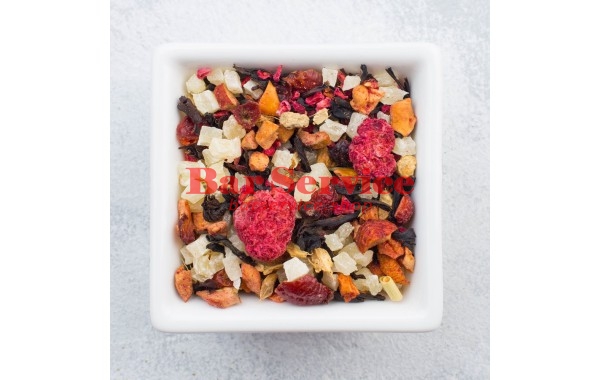 Состав: кусочки яблок, каркадэ, кусочки корицы, кусочки имбиря, бадьян, кардамон, гвоздика, кусочки апельсина с цедрой, ягоды боярышника и рябины красной, кусочки свёклы, цукаты клубники, малина, цукаты ананаса, листья стевии, натуральный ароматизатор